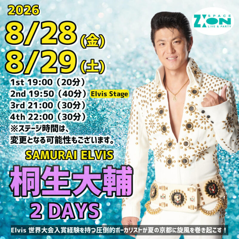 こんばんは、スペースジオンです。 先日、2026年の3/13(金)、14(土)は、男性ボーカル:桐生大輔の出演でございました! 大変に有り難いことに、両日とも沢山のお客様にご来店頂き、大いに盛り上がるステージでございました! ご来店頂きました皆様に、篤く御礼申し上げます。本当にありがとうございました♪ そして、改めて、桐生大輔の人気の凄さが証明されたわけでありました!流石サスガの桐生大輔!なのでありましたよ~♪ そしてそして。その桐生大輔。なんと、、、早くも、、、次回のスペースジオンの登場が!決まりました!おめでたい!なんともおめでたい~!! ちょっと先、というか、だいぶ先ではありますが! 2026年8/28(金)、29(土)であります! 桐生大輔、再び!2026年以内に、京都スペースジオンに、再登場であります! 3月のステージに引き続き、次回8月のステージも!大いに盛り上がる事、間違いございません! 前回のステージをご覧になられた皆様!あの盛り上がりが、再び!なのであります!そらもう見逃せませんよ~♪ 前回のステージをご覧になられておられない皆様!なにしろ抜群にエキサイティング!是非 …