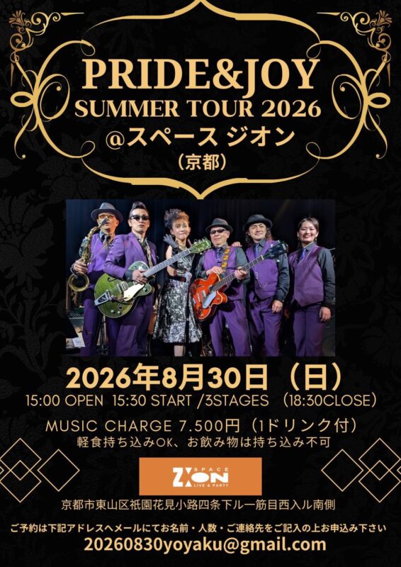 こんばんは、スペースジオンです。 ちょっと先のイベントでございますが、、、見逃せないイベントがございますよ! 2026年8/30(日)でございます! PRIDE & JOY(プライド&ジョイ)の貸切ライブイベント、当店にて開催なのですよ! ででん!コチラであります! 詳しいイベント内容は、フライヤーをどうぞ! コチラのイベントは、ご予約受付に関しては、基本的に当スペースジオンではお受けしておりません。 ご予約をご希望の方は、フライヤー記載のアドレス 20260830yoyaku@gmail.com まで、お問い合わせをお願いいたします。 ただ、当店にご連絡をいただいた場合、ある程度のお時間はいただくことになると思いますが、主催者側に繋ぐことが可能と思われます。ご希望の方は 電話番号:075-551-2777 まで、お気軽にお問い合わせくださいませ。主催者側に連絡を取ってみますね。 大いに盛り上がる一日になること間違いなしであります!どうぞ、ご期待くださいませ♪ スペースジオン 電話番号:075-551-2777