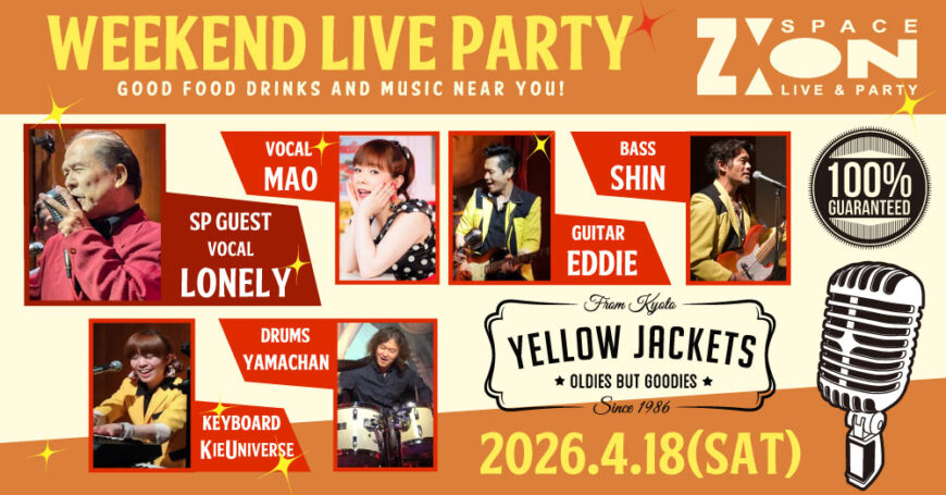 そして4/18(土)は、男性ボーカル:ロンリー&女性ボーカル:マオちゃんのフロントボーカル陣でございます! 全出演メンバーは! 男性ボーカル:ロンリー 女性ボーカル:マオちゃん ギター:エディ ベース:シン キーボード:きえユニバース ドラム:山ちゃん であります!