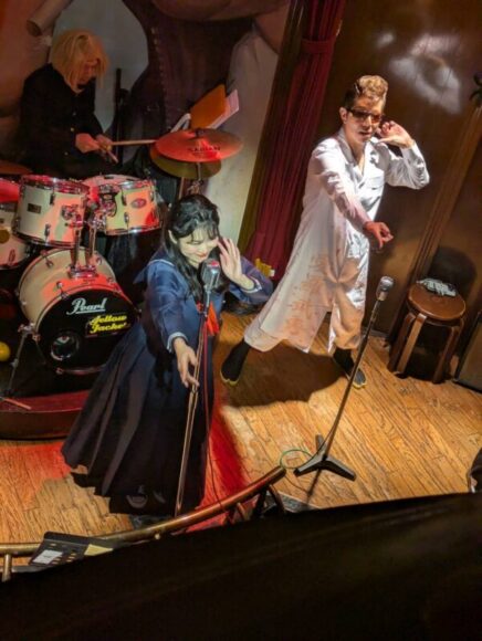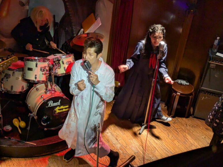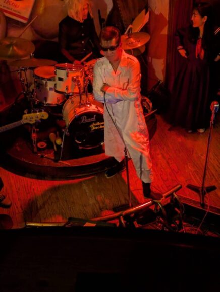 男性ボーカル:ジーンのサマになりすぎる立ち姿! 後ろで、エリちゃんとドラム:タケシが、「ジーンぱいせん、、、マジ、カッコエエっすね!」みたいな会話をしているっぽいです笑。